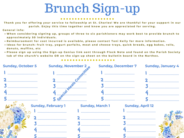 St. Charles YouTube Channel LinkClick the link below to sign-up for First Sunday of the Month Brunch or sign-up on the bulletin board in the Narthex!